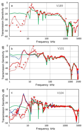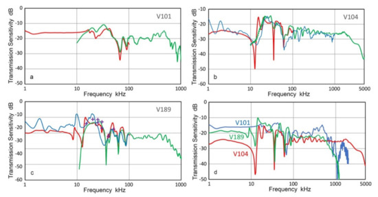 The transmission sensitivities, Tv, of three Olympus transducers (V101, V104 and V189) are shown in Figure 4. In Figure 4a–c, Tv-spectra of both low-frequency (under 100 kHz, using chirp) and high-frequency (above 20 kHz, using pulse) tests are given in red and green curves. The transition from the low-frequency spectra to high-frequency spectra matches well. Since the low-frequency data was obtained at a higher resolution using chirp signals, the high-frequency data were used above 80 to 100 kHz, selecting to make a smooth transition. Three combined spectra are shown in Figure 4d. In the case of V189 transducer, sine wave test data was available between 20 and 50 kHz and plotted in purple + symbols in Figure 4c. These matched well with both chirp and pulse interferometric results. The sine wave data was obtained using the same SH-140 interferometer as the pulse data.