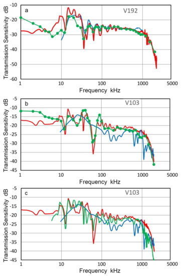 Transmission sensitivities of two transducers. (a) V192. (b,c) V103, using indirect method. Blue curves are from Thales interferometer for comparison, red and green dotted curves are from the indirect method. Three receivers, V101, V104 and V189 were used and spectral results averaged. Red curve used short pulse excitation while green dotted curve was with sine wave excitation. For green curve in (c), KRNBB receiver was used on six positions and spectral results averaged.