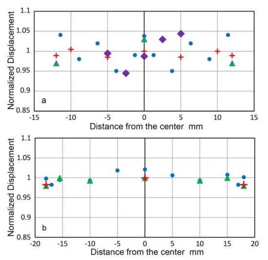In previous laser interferometric studies of transmission sensitivities, Tv, a few additional spots were chosen to determine displacement spectra away from the center position. Noting that the peak amplitude is within ±0.3 dB for Olympus V104, V192 and V195, it was assumed that the central Tv spectrum adequately represents the transducer behavior. Observed positional dependence of peak displacement amplitude is shown in Figure 6. In Figure 6a, blue dots are for V104, tested using a Picoscale scanning vibrometer with F03 sensor head (SmarAct, Oldenburg, Germany). Two other V104 sets (green triangles and red + symbols) used Thales SH-140, as noted previously. Amplitude data for V192 (green triangles) and for V195 (red + symbols) in Figure 6b used SH-140. Another approach was to use a small aperture AE sensor (KRNBB-PCP, KRN Services, Richland, WA, USA) to actually measure the distribution of peak displacement outputs and Tv spectra, as shown in Figure 6a (purple diamond) for Olympus V103 and in Figure 6b (blue dots, data from [27]) for Olympus V192. Olympus V103 transducer exhibited the peak amplitude variation of ±0.34 dB. Its average Tv spectrum was plotted in Figure 5c above and the standard deviation of the spectra was 2.37 dB over 6 kHz to 2 MHz. Olympus V192 transducer exhibited the peak amplitude variation of ±0.26 dB. For this case, Tv spectrum changes were <2 dB [27].