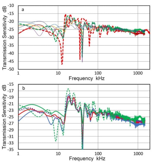 At the main sensitivity peak (123.5 kHz in Figure 14b), metallic backing reduced receiving sensitivities by about 10 dB, whereas the reduction with PMMA was 4 dB. The sensitivity reduction, however, produced peak broadening of about 30 kHz. For the two higher frequency peaks due to the thickness resonances, effects were smaller in all the backing materials. Even though brass has the closest Z value to that of PZT, no special benefits seem to emerge from the present results. This was surprising since brass had been a favored material to avoid transmission loss. See e.g., Moffatt et al. [37]. Larger effects on the radial mode may be related to the force applied in the above tests, even though the force maximized the sensor outputs. Another test set-up is needed to avoid compressive force, but testing of disk elements with transmitters of known Tv spectra will be useful to design sensors for special needs.