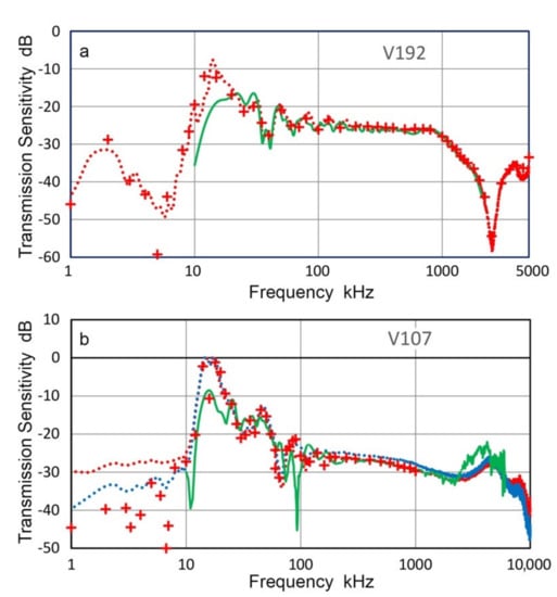 Comparison of LI-based (green curves) and CS-based transmission sensitivities. Red dot curves: CS-16 using short pulse excitation of a transmitter. Red + symbols: CS-16 using sine wave excitation. Blue dot curve: CS-16 using long pulse excitation. (a). V192. (b). V107.
