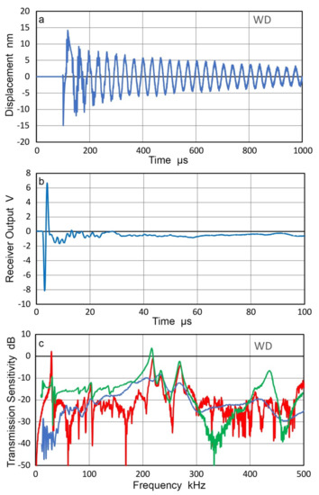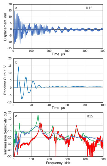 Using the receiving sensitivity of V103, Tv spectra were obtained for WD and R15 as transmitters and plotted by blue curves in Figure 11c and Figure 12c. The Tv spectra are plotted for the two sensors from laser interferometer outputs (red curves) and CS-16 outputs (green curves). As expected, LI-based and CS-based Tv spectra show a series of sharp resonance peaks, whereas the face-to-face experiment using V103 receiver produced damped responses. Note that the resonant frequency as a transmitter is lower than the corresponding resonant frequency as a receiver. For R15 receivers, the peak frequencies were 150–165 kHz [21,23], while the R15 transmitter (cf. Figure 12) showed peaks at 130 kHz.