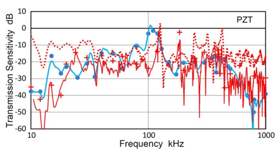 Transmission sensitivities of a PZT element by indirect method using V189 and KRNBB as receivers. Blue curve: V189, long pulse; Blue dots: V189, sine wave. Red curve: KRNBB, long pulse, back face coupled to V189; Red dot curve: KRNBB, long pulse, free back face, Red + symbols: KRNBB, sine wave.