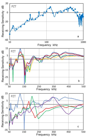- Ono, K. Frequency dependence of receiving sensitivity of ultrasonic transducers and acoustic emission sensors. Sensors 2018, 18, 3861. [Google Scholar] [CrossRef] [PubMed] [Green Version]