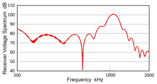 In most of previous transmission sensitivity tests, a short pulse excitation was used. While this was adequate for the frequency range of interest, 20 kHz to 15 MHz, it was necessary to consider other excitation schemes at lower frequencies. Uses of continuous sine waves, chirp waveforms, and longer pulse waveforms were examined with respect to Tv spectra. For these tests, the arbitrary waveform generator function of Picoscope 5242D and a power amplifier (HP467A, Hewlett Packard, Palo Alto, CA, USA) were used. We also used the same pulse generator as before, but removed the 50-Ω shunt resistor or increased the shunt to 10 kΩ. These steps increased the low frequency contents of the excitation pulses.