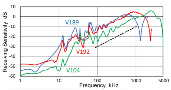 Three representative receiving sensitivities, Rv, of UT transducers, V104, V189 and V192, are plotted in Figure 18. These were averages of at least two Rv measurements with different transmitters. All three spectra and one for V103 (cf. Figure 17) exhibited linear frequency dependence below the main resonance peak and are parallel to the black dash line drawn in both figures. This is indicative of damped resonance behavior, as discussed in previous works [36,39]. This linear dependence was referred to as Type 1. In all four spectra, this Type 1 region is followed by a steep decrease (<25 kHz for V103 and V104; <12 kHz for V101 and V192), which was referred to as Type 2 with the 2nd or 3rd power of frequency. Below the Type-2 part is a region of lower frequency dependence (<10 kHz for V103 and V104; <8 kHz for V192; <3 kHz for V101). In these low frequency regions, effect of the input impedance of digital oscilloscope, Zin, is significant even when Zin was 1 MΩ as in the present tests. Thus, the lowest frequency region is expected to show a flat response as previously observed in [36].