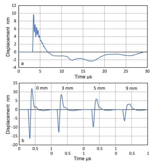 For the first approach, a transmitter (FC500, AET Corp, Sacramento, CA, USA) was glued to a surface of a polished buffer plate of Al7075 (38.3-mm thick, 150 × 152 mm2). FC500 was excited by a step pulse. The center normal displacement on free surface (before attaching to the buffer plate) was measured by using Thales SH-140 as described earlier, and is shown in Figure 20a. The peak value was 9.8 nm and it lasted over 30 µs. Displacements on the opposite face of the buffer plate were similarly measured at the center and at radial positions off center at 1, 2, 3, 4, 5, 7 and 9 mm. Four of the displacement waveforms are shown in Figure 20b. At the center (indicated as 0-mm position), the peak amplitude was −15.8 nm, which decreased at positions away from the center, down to 6.6 nm at 9-mm off. The displacements on the buffer plate were larger and much shorter, the main part lasting less than 0.5 µs (long before the reflected pulse returning after 12.2 µs). This indicates the loss of low frequency contents. The ratio of peak displacement amplitude of 1.62 = 15.8/9.8 is slightly higher than the predicted displacement ratio of 1.32 (2.41 dB), but the observed increases in displacement clearly demonstrate enlargement effects of a lower acoustic impedance medium (Z = 17.4 Mrayl for Al7075 vs. Z = 33 Mrayl for alumina). Note that sound pressure (=2πfZξ; f is frequency) is usually used in the UT literature and the sound pressure becomes lower in a low Z medium as wave enters from a high Z medium. The displacement amplitude rapidly decreased with radial distance, down to 6.6 nm at 9-mm off position. This decrease was five to ten times larger than those observed on transmitter faces, as shown in Figure 6. The large amplitude changes are expected from the thickness of the buffer plate (38.3 mm) since the near field distance at the nominal center frequency of FC500 (2.25 MHz) is 31.8 mm, which is comparable to its thickness.