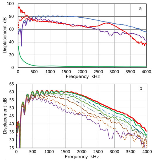 The FFT magnitude spectra of displacement waveforms are shown in Figure 21. In Figure 21a, red curve represents the transmitter displacement (from Figure 20a), blue and purple curves are for displacements on the buffer plate at the center and at 9-mm off. Other spectra for the displacements on the buffer plate are given in Figure 21b, including two shown in Figure 21a. The transmitter displacement spectrum was lower than that at the buffer plate center except below 300 kHz. It also showed a broad peak at 2.7 MHz, near its nominal center frequency. It appears this peak is suppressed when it is glued to the buffer plate. (Another example of face-loading effect, but this effect was absent in two other units of FC500 [21]). All the displacement spectra on the buffer plate decreased sharply with decreasing frequency below 500 kHz, where the near field distance is 4.1 mm, making the back surface well into the far field region. At higher frequencies, the radiation fields are more focused and contributed much faster decreases in spectral amplitude as the radial distance increased beyond 1 mm (green curve), as shown in Figure 21b. At 9-mm position, the amplitude loss was at 13 dB at 2 MHz.