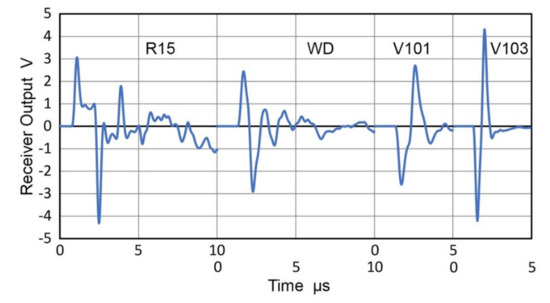 Receiver output waveforms from R15, WD, V101 and V103, coupled to the center of buffer plate. Tail parts are not shown.