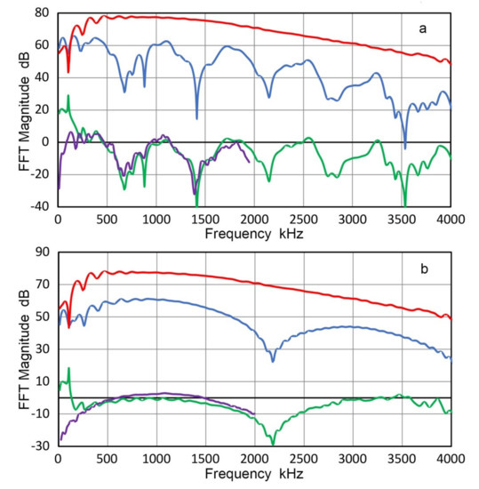 FFT magnitude spectrum of output signal of receiver on the buffer plate: (a) R15, (b) V103 (Blue curve: 0 dB reference is 1 V). The weighted average of displacement spectra of 0- to 7-mm position (Red curve: 0 dB reference is 1 nm). Receiving sensitivity (dB reference is 1 V/nm) obtained in this test (Green curve) and from a previous report (Purple curve) [23].