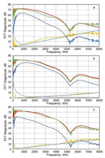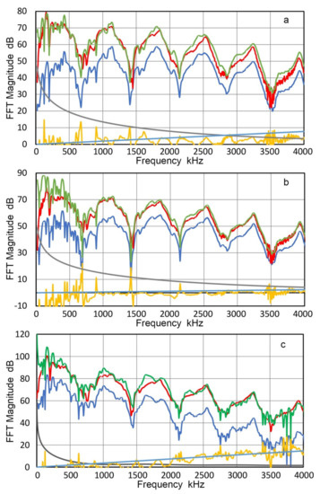 Three different buffer plates were used. For steel (Z = 46.5 Mrayl), a block of 100-mm thick A533B steel plate (285 × 158 mm2) was used after the top and bottom surfaces were polished. This was in mill-annealed condition from Kawasaki Steel, Chiba, Japan. 110-mm long Al7075 round (Z = 17.4 Mrayl; 127-mm diameter; sample N18 in [41]) and 38.6-mm thick PMMA plate from [41] (Z = 3.20 Mrayl; 170 × 90 mm2) were also used. Several different transmitter-receiver pairs were used, combining 25.4-mm transducers, V101, V104 and V107 and 12.7-mm transducers and sensors, V111, NDT C16, R15 and WD. Two representative sets are given in Figure 24 for the 25.4-mm pair of V107-V104 and in Figure 25 for the 12.7-mm pair of NDT C16-R15, respectively. In both of Figure 24 and Figure 25, red curves represent the output spectra of face-to-face tests, blues curves the same for buffered tests and green curves are for the reconstructed face-to-face output spectra. The order of buffer plate material was steel, Al and PMMA for both figures, that is, Figure 24a for steel, Figure 24b for Al and Figure 24c for PMMA. The gray curves also show the diffraction loss, the yellow curves observed attenuation and light blue curves fitted attenuation for viscous damping.