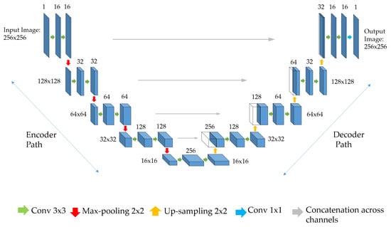 U-Net architecture. Each map’s dimensions are specified on the left side for the encoder path and on the right side for the decoder path. The number of channels is indicated above each blue box. Both the input image (leftmost map) and the output prediction (rightmost map) are 256 × 256 pixels. As specified in the legend, green and blue arrows represent convolutions, red and yellow represent max-pooling and up-sampling operations, while the grey ones represent concatenation operations.