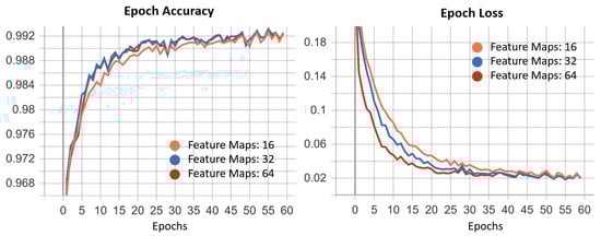 We trained our model for 60 epochs and we tested the same architecture varying the number of feature maps in the first layer for 16, 32, and 64. The loss function used is the cross-entropy function.
