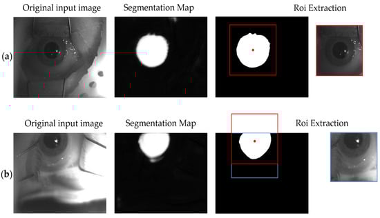 Once the eye was located in the image, it was possible to identify a window around it, which was applied to the original image for ROI extraction. The centroid of the ROI was computed, and the binary prediction was cropped by a 350 × 350 pixels squared window centered on the ROI centroids coordinates (Figure 5 red dots). Its size was selected to be large enough to guarantee the inclusion of all of the ocular features within the window. In case the eye was located at the edges of the image, the cropping ROI exited the image as depicted in Figure 5b. In this case, the window was translated along the axis until the window was completely inside the image (blue square).