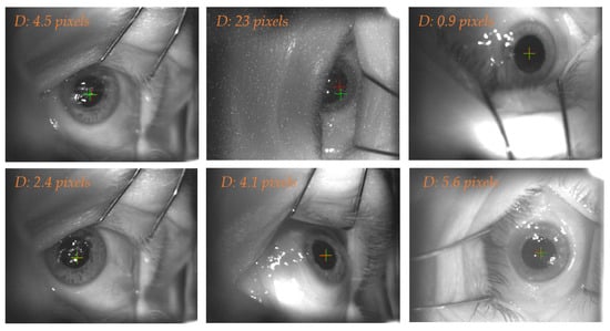 This network received the original image as input and predicted the eye position, resulting in the eye center coordinates. To evaluate its performance, we computed the Euclidean distance between the predicted eye center and the ground truth label. For the 57 frames included in the test set, median (IQR) Euclidean distance, was 3.05 (4.14) pixels. Figure 6 illustrates some exemplary cases.