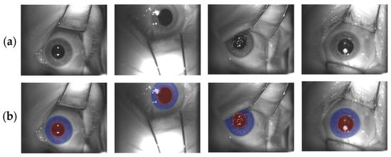 The original images (a) and final U-Net predictions (b). The predicted iris and pupil areas are depicted in blue and red, respectively. The red and blue continuous lines are the ground truth contours of pupil and iris, respectively.