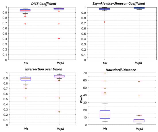 Boxplots of Dice, Szymkiewicz–Simpson, IoU and Hausdorff Distance (expressed in pixels). Iris and pupil predictions were performed with the iris U-Net and the pupil U-Net, respectively, on an ROI image. The metrics were evaluated once the 350 × 350 pixels probabilistic maps were restored on the original image size (512 × 640).