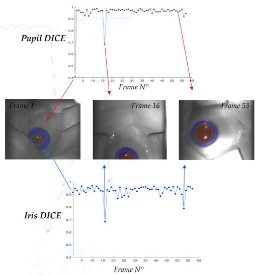 Graphical representation of the Dice coefficients coming from the comparison between the predicted and manually contoured structures (iris and pupil) for the 57th frames present in the test set. Furthermore, the figure depicts examples of failed pupil segmentation (frame 1 and 16) and failed iris segmentation (frame 16 and 53). In frame n° 1 iris prediction worked correctly (iris Dice = 0.92) while pupil prediction failed (pupil Dice = 0.41). On the other side, frame 53 presents an iris Dice = 0.76 while pupil Dice = 0.94. The worst case is the frame 16 in which both the Pupil and Iris U-Net underperformed (Pupil Dice = 0.68 and Iris Dice = 0.68).
