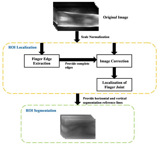 Finger vein recognition generally includes four main steps: image acquisition, preprocessing, feature extraction, and matching recognition. In the process of finger vein image acquisition, the image quality is relatively poor because it is easily affected by environmental factors such as uneven illumination and temperature, and also by personal factors such as finger image translation, rotation, scaling, and gesture changes. The global pandemic in recent years has raised public health safety issues to an unprecedented level, prompting the development of acquisition methods in a contactless, unconstrained direction, which has exacerbated the impact of external factors on acquisition effectiveness. Extracting the vein information from the fixed area of a finger as Region of Interest (ROI) for feature extraction, ensures the minimal differences between the features obtained for identification of the same individual under different conditions []. Therefore, a robust, accurate, and fast ROI extraction method is crucial in preprocessing, which largely determines the efficiency and reliability of the finger vein recognition system. The goal of finger vein ROI extraction is to maximize the retention of valuable regions and remove useless regions from the acquired images, which requires addressing three aspects: finger region segmentation, image correction, and vertical reference line positioning. At present, researchers have proposed many solutions to these three problems, but the existing methods are not very satisfactory in terms of reliability, robustness, and efficiency due to various external factors, such as image translation and rotation, as well as uneven illumination or background interference. Therefore, we endeavor to explore a robust and efficient ROI extraction method for finger vein images. In this paper, we propose a novel ROI extraction method based on the original finger vein image characteristics, which mainly includes: