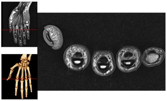 - we chose to localize the distal joint cavity. The distal and proximal joint cavity positions is defined as , respectively, and the cumulative values in each of three columns on the gained gradient image are calculated. The minimum coordinate can be calculated by Equation (9). After restoring, we can obtain the distal joint cavity. The proximal joint cavity position is obtained by the finger width w at the distal joint. The detailed formula is as shown below: