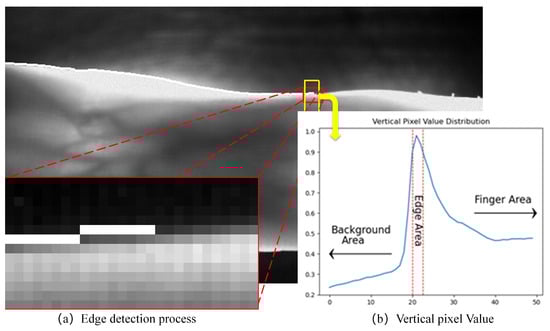 Edge detection process (a) Partial zoom during edge detection, (b) Column pixel accumulation in the area near the finger edge.