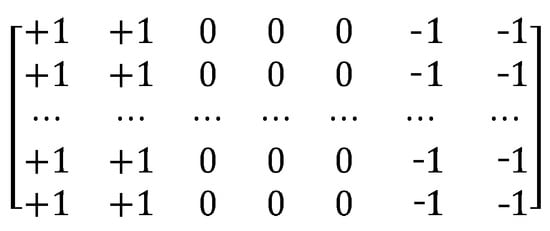For finger vein images, it can be considered that the gradient closer to the center of the image is more likely to be the finger region. Meanwhile, the vein pattern inside the finger generates a gradient when the gradient is calculated for the horizontal direction. Therefore, a weight that has a fast rate of change in the background region and a slow rate of change in the internal finger region is needed. To achieve accurate localization of the search starting point, we propose an improved horizontal Sobel operator, as shown in Equation (2).