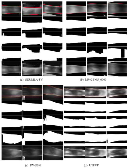In this experiment, we choose two representative finger region segmentation methods. In order to verify whether the proposed segmentation method has high accuracy and efficiency or not, we use the typical images introduced in Section 4.1 for comparison. The first one is the threshold-based ROI extraction method proposed by Kumar et al. [] (on different datasets, we try to find the optimal binarization threshold); the second one is the coarse extraction method in the mask-based approach proposed by Lu et al. []. We give the performance of different methods on these images, and Figure 8 shows the results. We demonstrated the segmentation results of different methods for different quality images in different datasets. For each dataset, the first row shows the single-pixel contiguous edge points obtained by this method (for easy observation, we have labeled the points adjacent to the top and bottom of the edge as well); the second row shows the mask obtained using the method proposed in this paper (this method does not require a mask to split the finger area, the mask here is only used for visual comparison); the third row shows the mask obtained using the method proposed by Lu et al. []; the fourth row shows the mask obtained using the method proposed by Kuamr et al. []; the fifth row shows the original image.