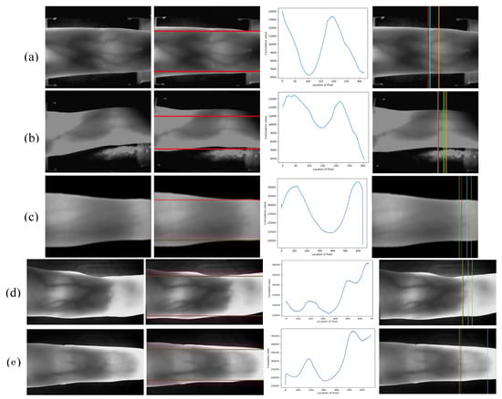 ROI extraction of finger vein images requires rapid extraction of the same region from vein images collected from the same individual under different conditions. After the previous two steps, the upper and lower horizontal reference lines have been obtained. Next, a segmentation reference line needs to be found in the vertical direction. By understanding the nature of the finger’s structure, we know the gaps between the cartilage of the finger will be more transparent to infrared light under ideal conditions. In the digital vein image, the joint cavity is shown as two brighter areas. Qin et al. [] found that the distance between two joints was 1.2–1.3 times the width of the finger at the distal joint by statistics. Thus, we selected the joint cavity as the vertical reference line for ROI extraction of finger vein.