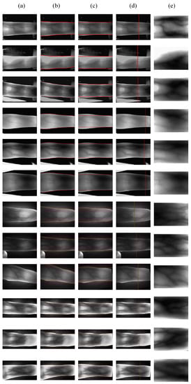 ROI extraction using the proposed method. (a) original images; (b) finger edges; (c) final horizontal reference lines positioning; (d) distal joints positioning; (e) extracted ROIs.