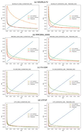 Comparisons of the ROC curves of different kinds of ROIs, obtained by using maximum curvature and repeated line tracking, respectively. (a) SDUMLA-FV, (b) MMCBNU_6000, (c) FV-USM, and (d) UTFVP.