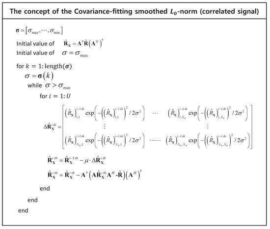 The smoothed -norm (SL0) [,] is a method of approximating the discontinuous function -norm with an arbitrary continuous function. The solution of the -norm function can be obtained by the global maxima of the corresponding function. This method requires less computations than solving the -norm minimization problem, and it does not require an accurate noise variance.