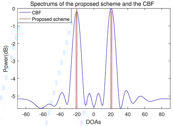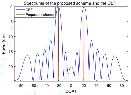 The resolution performance of the proposed scheme and the conventional beamforming algorithm is shown in Figure 4. In this case, the DOAs of two incident signals are and . In the conventional beamforming algorithm, it can be seen that the two incident signals cannot be resolved. In contrast to the conventional beamforming algorithm, it can be seen that the proposed scheme accurately resolves the two adjacent incident signals at interval.