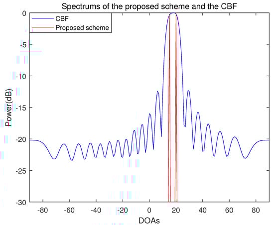 Spectrum of the proposed scheme and the conventional beamforming algorithm when the number of sensors is 20, the number of samples is 500 and the incident angles are and (SNR = 10 dB).