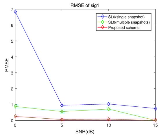 RMSE of the proposed scheme, the conventional smoothed norm method and multiple snapshots smoothed norm method when the number of sensors is 10, the number of samples is 100 and the incident angles are and (sig1).