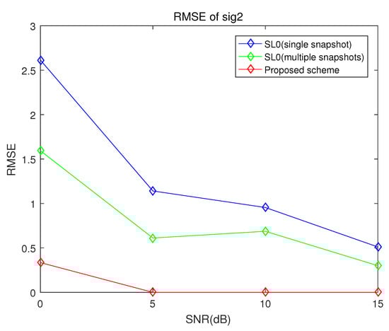 RMSE of the proposed scheme, the conventional smoothed norm method and multiple snapshots smoothed norm method when the number of sensors is 10, the number of samples is 100 and the incident angles are and (sig2).