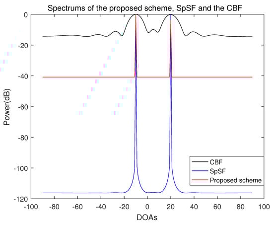 Spectrum of the proposed scheme, SpSF and the conventional beamforming algorithm when the number of sensors is 10, the number of samples is 1000 and the incident angles are and (SNR = 5 dB).