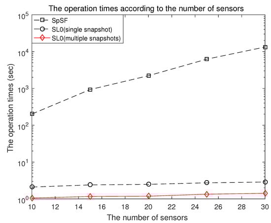 The operation times of the proposed scheme, the multiple snapshots-based smoothed norm method and the SpSF algorithm with respect to the number of sensors are shown in Figure 9. The computational complexity is measured by using the operation time function of MATLAB and the specifications of the computer include an Intel(R) Core(TM) i7-6700 CPU @ 3.40 GHz (Santa Clara, CA, USA). The operation time of the SpSF is s. It can be verified in Figure 9 that the computational complexity of the proposed scheme is significantly lower than that of the SpSF. The proposed scheme is more efficient than SpSF by considering both aspects of the performance of DOA estimation and computational complexity.