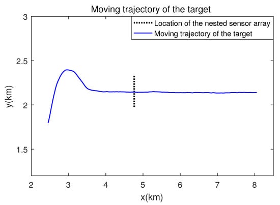 Figure 12, Figure 13, Figure 14 and Figure 15 show the case where the pilot signal with an abnormally large signal level is emitted from the moving signal source in order to accurately estimate the moving trajectory of the target using the nested sensor array, so the trajectories of the other ships do not appear in the BTR, but only that of the target. The compressive-sensing-based DOA estimation methods have superior performance than the beamforming-based methods. Therefore, in Figure 12 and Figure 13, the compressive-sensing-based methods show the trajectory of the moving target with higher resolution on the BTR than the beamforming-based methods in Figure 14 and Figure 15. The proposed scheme and the SpSF have practically the same performance regarding the DOA estimation.