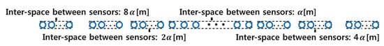 The results for one of them is shown in this paper. The received data from the sensor array was collected for 66 min. During the collection, objects other than the moving target to be detected appeared and disappeared. Information, such as the nested sensor array specifications and the design frequencies, is confidential, so every frequency-related piece of information is normalized by a pilot signal frequency, and the structure of the sensor array is shown in Figure 11.