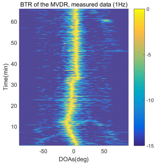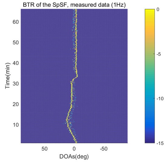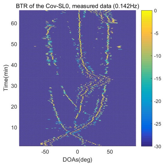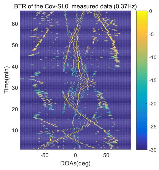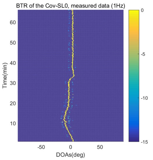 The BTR is a figure that sequentially stacks the DOA estimation results of the measured data divided by 10 s. Through the corresponding BTR, the moving paths of the targets, which were detected by the nested sensor array for 66 min, can be estimated. In the SpSF, a noise variance of a received signal should be provided in advance. Therefore, a value of the noise variance for each received datum used for one instance of DOA estimation is obtained through preprocessing.