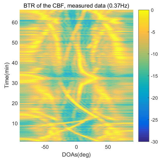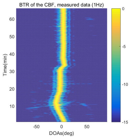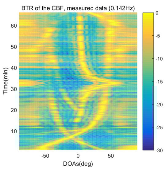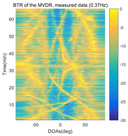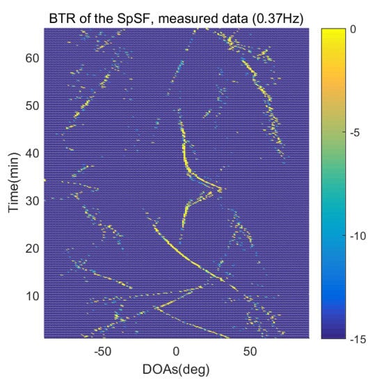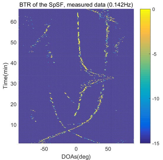 However, when comparing the BTRs of the SpSF algorithm and that of the beamforming methods, it can be seen that a lot of information about the moving trajectories of the other ships were removed from the BTRS of the SpSF algorithm. On the other hand, the BTRs of the proposed scheme preserve more moving trajectories of the other ships than that of the SpSF algorithm. It is verified through Figure 16, Figure 17, Figure 18, Figure 19, Figure 20, Figure 21, Figure 22 and Figure 23 that the proposed scheme is more appropriate than the SpSF algorithm when the DOAs of the target and the other signal sources must be simultaneously estimated.