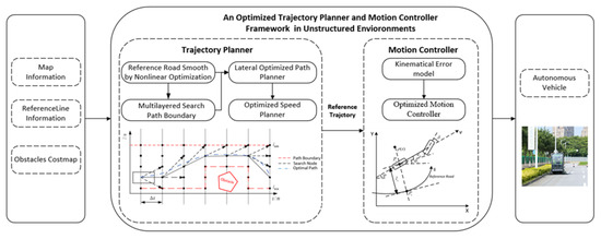 An optimized trajectory planner and motion controller framework were proposed in order to ensure the safety of autonomous driving in unstructured environments. On the one hand, the nonlinear optimization method was applied to smooth the reference road based on the vehicle kinematic model in the space domain. The trajectory planning consisted of longitudinal and lateral planning sub-tasks. The multilayered search method in the lateral-space graph created safe driving corridors to avoid obstacles. Furthermore, the lateral optimized path was obtained by considering the distance to the reference road and the smoothness of the path. Similarly, the optimal speed profile was optimized using a speed-space graph to achieve the desired velocity and simultaneously meet the acceleration constraints. On the other hand, an optimized motion controller based on a vehicle kinematic model was introduced to track the desired trajectory. The results illustrate that the proposed trajectory planner and motion controller framework can handle different situations and keep safe in unstructured environments. It can smoothly and safely avoid different irregular obstacles. In addition, the optimized motion controller has less overshoot and lateral errors.