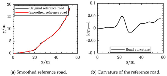 The result of a smoothed example is shown in the Figure 3a. The black line is the original reference road, which is very uneven and has a lot of burrs in the graph. The smoothed reference road is shown as a red line. In addition, the curvature of the reference road is shown in the Figure 3b. Its smoothness meets the requirements of the vehicle.