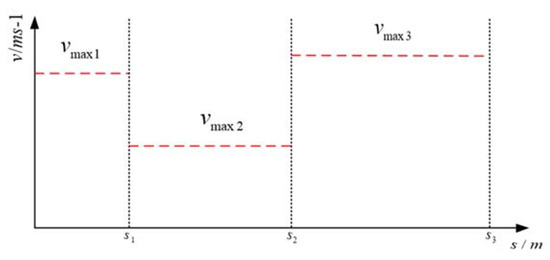 After calculating the desired path, speed planning is performed at each point. The optimized speed planner is applied to achieve the desired speed in the unstructured environment. Each point on the reference path has a different speed limit, such as deceleration being required where the curvature is too large to meet the lateral acceleration constraint. At the same time, the vehicle motion needs to satisfy the acceleration and deceleration constraints. The speed limits at each longitudinal distance are shown in Figure 5, where , , and are the speed limits at different stages.