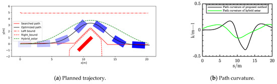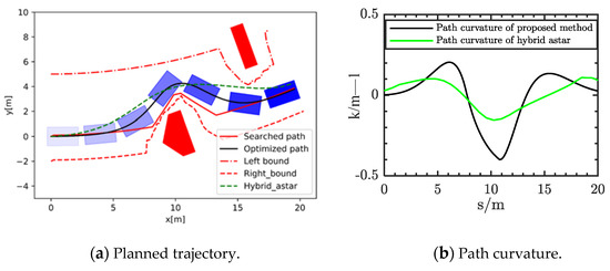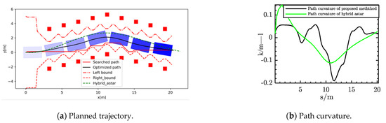 An environment with a curvy road was designed as in Figure 9. There are two obstacles on both sides of the reference road and each obstacle takes up half the width of the lane. The ego vehicle can also avoid two separate obstacles while satisfying the vehicle curvature constraint of the curvy road. We created safe driving corridors along the direction of the road through the searched path. The optimized result is shown as the black line in Figure 9a. The change of curvature during the whole process is shown in Figure 9b. The maximum curvature of the path reaches 0.4. Although the curvature is larger than the result of hybrid A star, it can ensure the safety of the trajectory within the certain safe distance. In addition, the discrete sampling distance of the reference line was 0.2 m. As the sampling distance decreases, the optimized trajectory will be smoother, but the planning operation time will increase accordingly. The ego vehicle avoids obstacles and returns to the reference road as soon as possible.