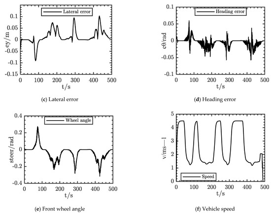 The lateral displacement error and heading angle error are shown in Figure 10c,d. From the graph, it can be seen that the optimized motion controller could effectively guarantee the convergence of the heading angle deviation and the lateral displacement deviation. The average lateral deviation during the whole process was less than 15 cm. The maximum lateral deviation was 12 cm at the U-turn, which was due to the larger curvature. The maximum heading angle deviation did not exceed 5 degrees. It could meet the requirements of the motion planner. The wheel angle and the vehicle speed are shown in Figure 10e,f. The maximum front wheel rotation angle reached 18 degree at the U-turn. It could meet the maximum steering angle limit. The speed of the reference point was 4.5 m/s. However, due to the limitation of lateral acceleration, the speed was limited to 1.5 m/s during the turn. The prosed method can slow down in advance before turning. At the same time, it can satisfy the constraints of the control input.