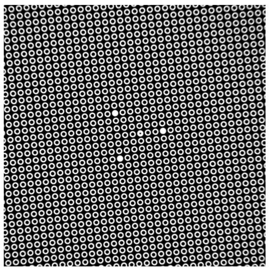 Figure 1 shows the image of the pattern, rotated at an angle of 7 deg, obtained using a digital camera with the sensor parameters 1280 × 1024 pixels, the pixel size is 5.2 × 5.2 μm; the pattern parameters − the diameter of the elements is 100 μm, the period is 150 μm; the lens magnification is –1× (1×, 40 mm WD CompactTL™ Telecentric Lens, Edmund Optics product). The position of the 2D pattern perpendicular to the optical axis was adjusted using an autocollimator and structural elements.
