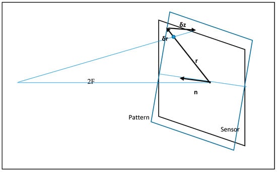 Suppose that the camera sensor is perpendicular to the optical axis, and the pattern is tilted at a small angle , where  is the unit vector directed along the tilt axis (Figure 2). Obviously,  lies both in the plane of the sensor and the pattern, exactly on the line of their intersection.
