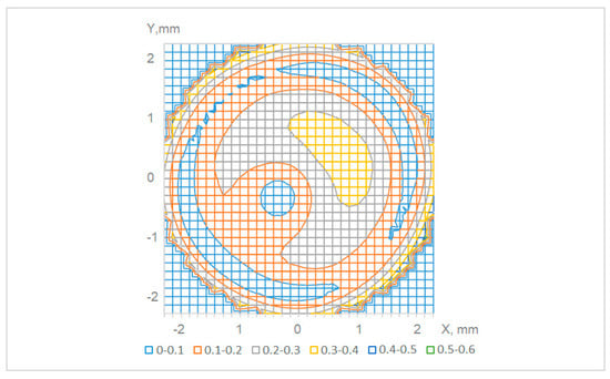 When measuring the angle, the coordinates of the centers of the pattern elements are calculated with an accuracy of hundredths of a pixel. In this case, an array of deviations of the elements’ centers along the X and Y axes relative to the ideal grid dx (X, Y) and dy (X, Y) is formed. Based on these shifts, a shift vectors field is possible to be constructed, representing the distortion and mutual inclination of the sensor pattern (Figure 4). The bottom row of color indices in Figure 4 shows the scale of shifts from 0 to 0.6 pixels with 0.1 pixel increment.
