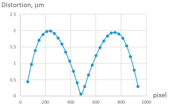 Figure 5 shows a graph of the central section of a 5th order two-dimensional distortion function, calculated from a series of 12 images. As can be seen from the graph, the depth of distortions does not exceed 2 μm.